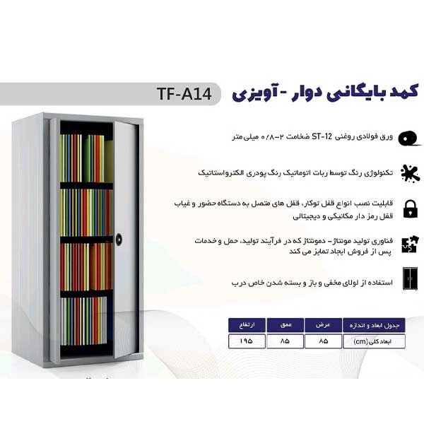 کمد بایگانی دوار پوشه‌آویز مدل TF-A14 با ابعاد ۱۹۵×۸۵×۸۵ سانتی‌متر، از فولاد روغنی ST-12 ساخته شده و پوشش آن با رنگ پودری الکترواستاتیک توسط ربات اتوماتیک انجام می‌پذیرد. سیستم چرخش مکانیکی ۳۶۰ درجه همراه با دسته‌ی ارگونومیک، دسترسی سریع و بدون نیاز به نیروی زیاد به پوشه‌ها را ممکن می‌سازد. این کمد پوشه‌آویز ثابت، مناسب بایگانی اسناد اداری در فضای محدود ادارات است.